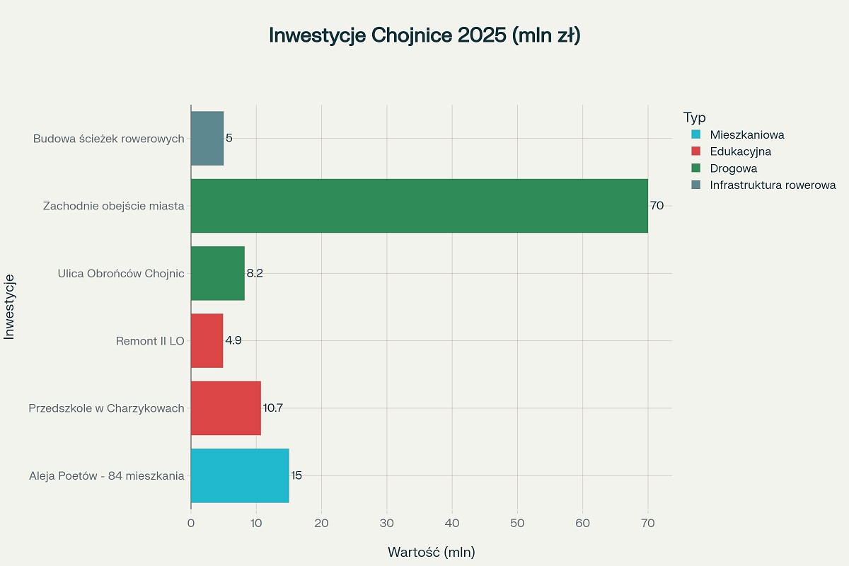 Rok 2025 zapisze się w historii Chojnic jako okres intensywnego rozwoju infrastruktury miejskiej i społecznej. Łączna wartość najważniejszych inwestycji przekracza 113 mln złotych, obejmując zarówno spektakularne projekty drogowe, jak zachodnie obejście miasta za 70 mln zł, jak i kluczowe inwestycje społeczne, takie jak przedszkole w Charzykowach za 10,7 mln zł. Kompleksowa modernizacja ulicy Obrońców Chojnic za 8,2 mln zł oraz remont II Liceum Ogólnokształcącego za 4,9 mln zł pokazują, że władze miasta koncentrują się równomiernie na poprawie komunikacji oraz podnoszeniu standardu placówek edukacyjnych.