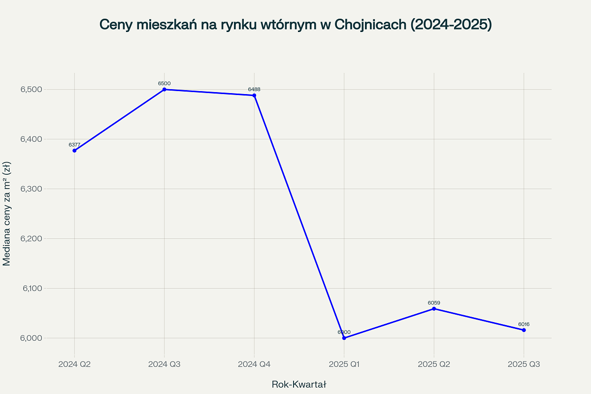 Dynamiczny rozwój Chojnic nie pozostaje bez wpływu na lokalny rynek nieruchomości. Według danych z portalu Adresowo.pl, w III kwartale 2025 roku mediana ceny za metr kwadratowy mieszkań wyniosła 6 016 zł/m², co stanowi spadek o 43 zł/m² w porównaniu do poprzedniego kwartału. Dla porównania, średnia cena mieszkania w Chojnicach to obecnie około 339 500 zł, przy średniej powierzchni wynoszącej 60 m².