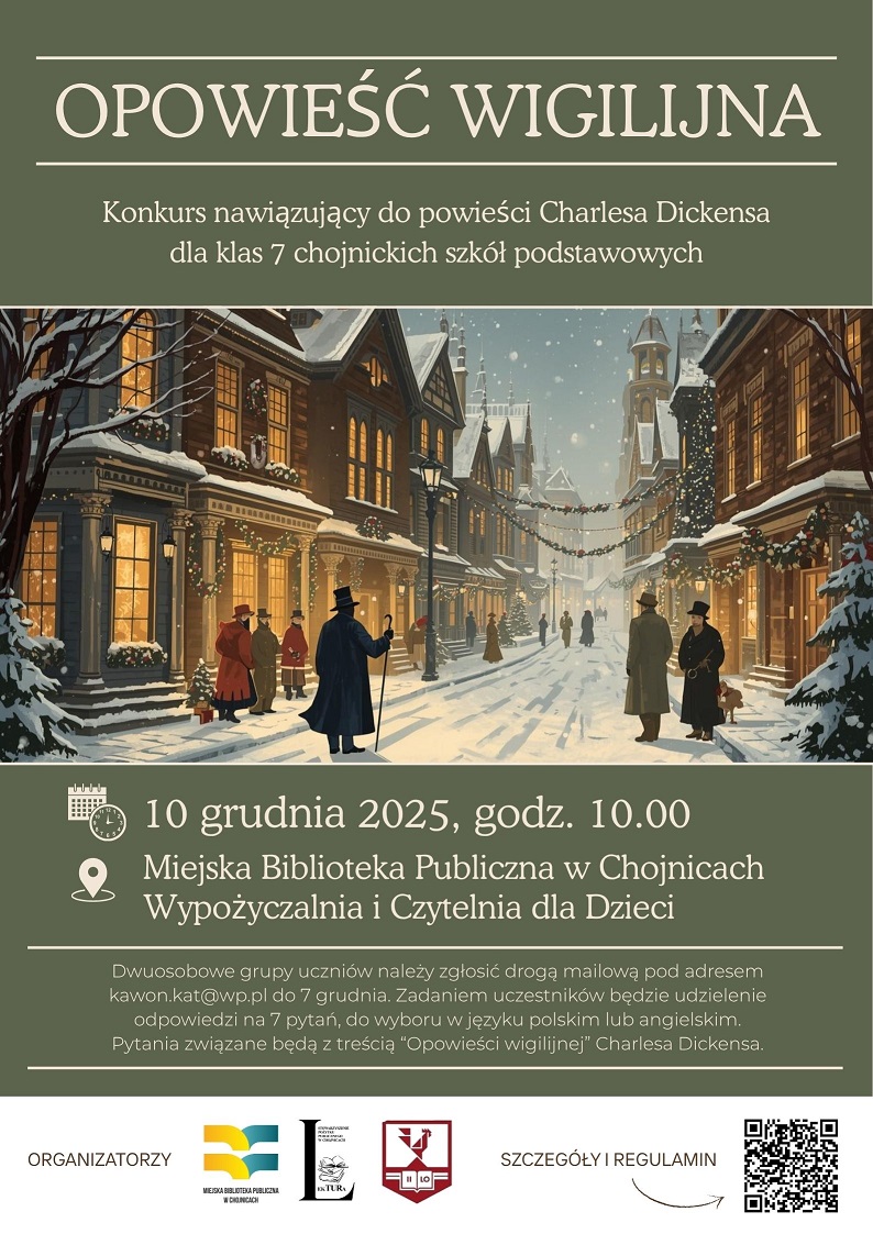 Miłośników świątecznego klimatu i powieści Charlesa Dickensa „Opowieść wigilijna” zachęcamy do wzięcia udziału w konkursie związanym z treścią książki. Odbędzie się on w Wypożyczalni i Czytelni dla Dzieci MBP w środę 10 grudnia 2025 roku w godzinach 10:00 - 12:00 i adresowany jest do uczniów klas 7 chojnickich szkół podstawowych.