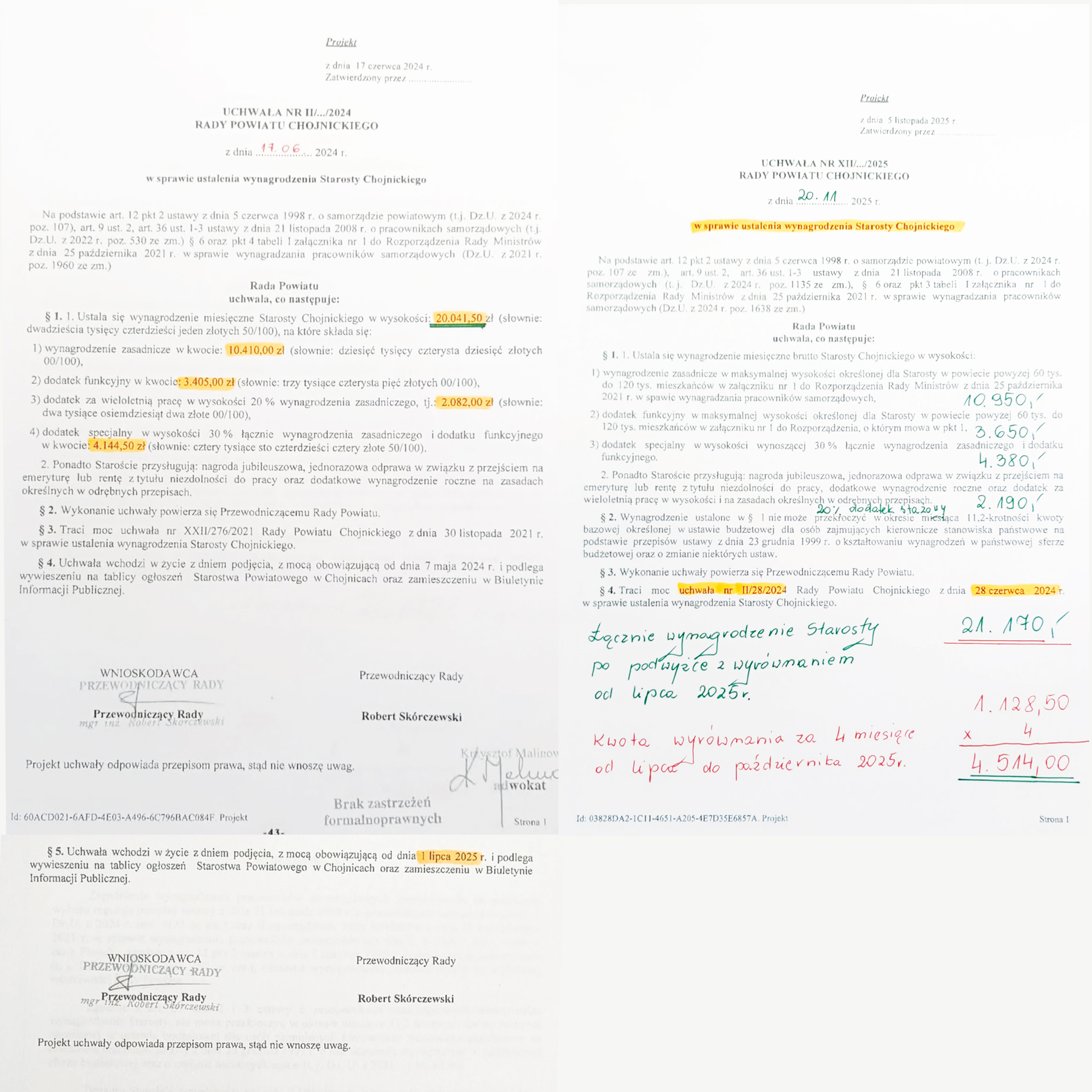 - Po zapoznaniu się z projektem uchwały oniemiałam - komuś - tu przewodniczącemu Rady Powiatu Chojnickiego, bardzo zależało na tym, by w uchwale nie było żadnych kwot wynagrodzenia starosty mimo, że przy poprzednich podwyżkach zawsze były podane wszystkie składniki wynagrodzenia - mówi Mirosława Dalecka. - Ciekawe jaki jest powód, by w tegorocznej uchwale ukryć wysokość podwyżki dla starosty? Radni, by zapoznać się ze skutkami podwyżki i nowymi składnikami wynagrodzenia, muszą zajrzeć do Rozporządzenia Rady Ministrów. Cóż za przebiegłość! Może chodzi o to, aby mieszkańcy sprawdzający na BIP uchwały, nie mieli pojęcia ile zarabia starosta i jaką otrzymał podwyżkę.
