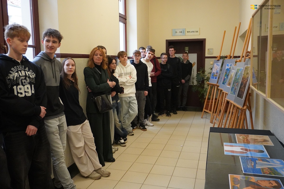 Następnie Oliwia Stanke opowiedziała o swoich grafikach. – „Prace są inspirowane głównie postaciami z książek i z filmów, ale są też pejzaże, wymyślone przeze mnie od podstaw. Stworzone są cyfrowo, w programach graficznych, głównie to Corel i Paint 3D” – mówiła. W swoich rysunkach ożywia postacie z książek, które wyobraża sobie na podstawie słów autorów. „Każdy szkic to opowieść - o emocjach, miejscach i chwilach zatrzymanych pomiędzy zdaniami. Inspirują mnie również pejzaże, w których odnajduję spokój i przestrzeń dla marzeń” – można przeczytać w opisie do ekspozycji.