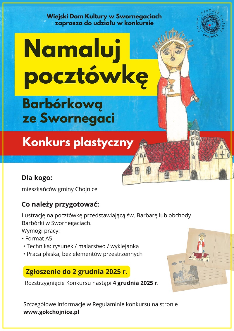 Gminny Ośrodek Kultury w Chojnicach – Wiejski Dom Kultury w Swornegaciach zaprasza dzieci, młodzież i osoby dorosłe do udziału w konkursie plastycznym! Stwórz pocztówkę inspirowaną św. Barbarą i obchodami Barbórki w Swornegaciach i pokaż swoją kreatywność.