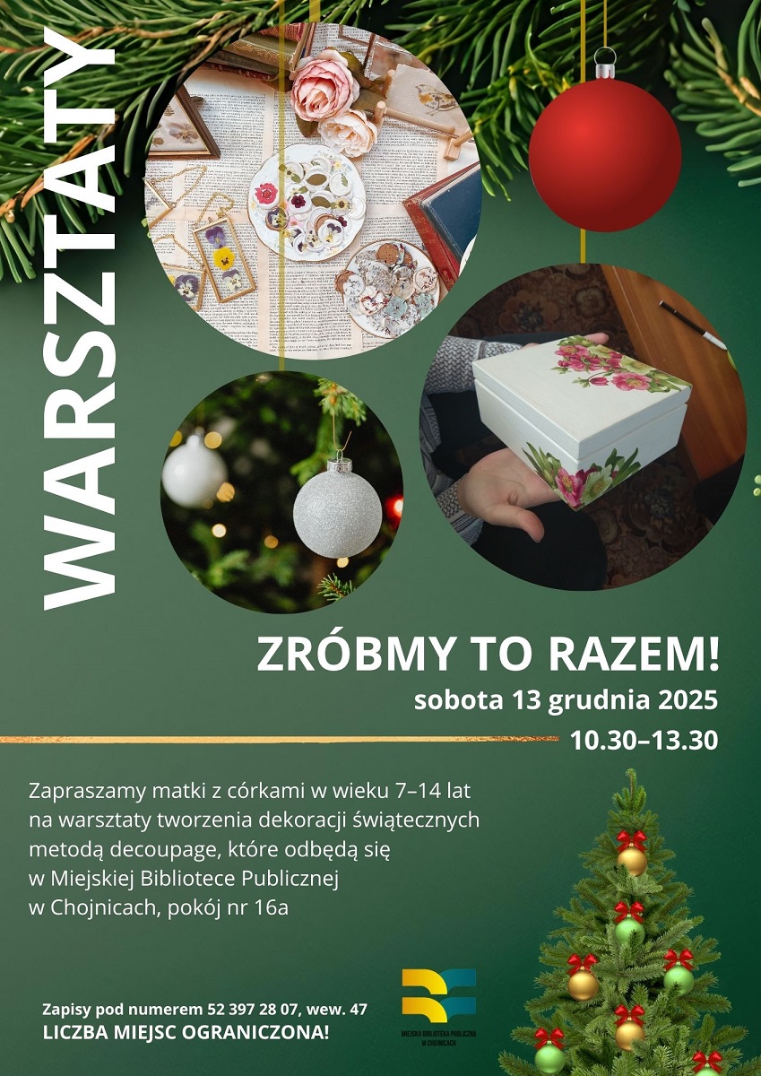 Miejska Biblioteka Publiczna w Chojnicach zaprasza matki i córki do wspólnego spędzenia czasu podczas wydarzenia „Zróbmy to razem!”, w czasie którego odbędą się warsztaty tworzenia dekoracji świątecznych metodą decoupage.