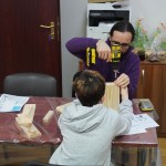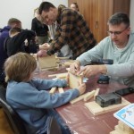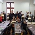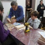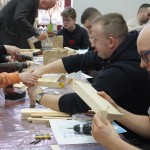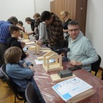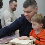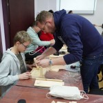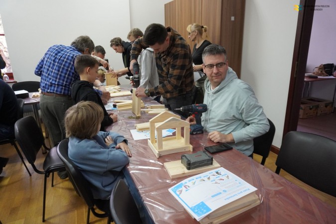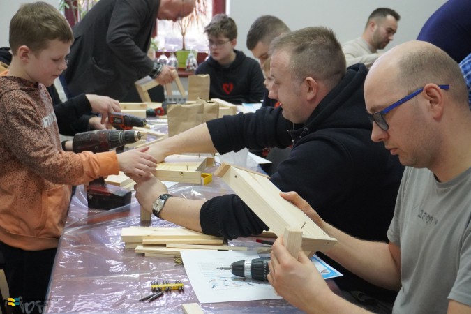 Po prezentacji przystąpiono do budowy karmników. Każda para – ojciec i syn – otrzymała gotowy, wcześniej przygotowany przez pana Andrzeja zestaw drewnianych elementów, które pod jego czujnym okiem trzeba było odpowiednio ułożyć oraz skręcić. Wszyscy ochoczo zabrali się do pracy. Wkrętarki poszły w ruch, a śrubki i wkręty szybko znajdowały przypisane sobie miejsca. Z fragmentów drewienek bardzo szybko powstawały coraz to pełniejsze karmniki. Na zakończenie zarówno na twarzach najmłodszych, jak i starszych widać było zadowolenie i dumę z wykonanego zadania. Gotowe karmniki uzupełnione zostały o ptasie jedzenie, czyli walce tłuszczowe na sznurku o smaku słonecznika, które rozdała wszystkim Ewelina Szpak.