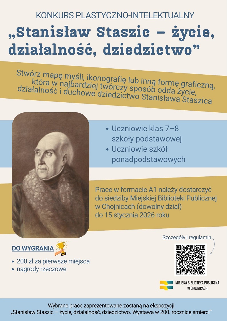 W 2026 roku przypada 200. rocznica śmierci Stanisława Staszica – jednej z najwybitniejszych postaci polskiego Oświecenia. Z tej okazji Miejska Biblioteka Publiczna w Chojnicach ogłasza konkurs plastyczno-intelektualny na mapę myśli, ikonografię lub inną formę graficzną, która w najbardziej twórczy sposób odda życie, działalność i duchowe dziedzictwo Stanisława Staszica. Na konkurs pod hasłem „Stanisław Staszic – życie, działalność, dziedzictwo” należy zgłosić prace oryginalne, inspirujące, ukazujące Staszica jako człowieka czynu, nauki i idei.