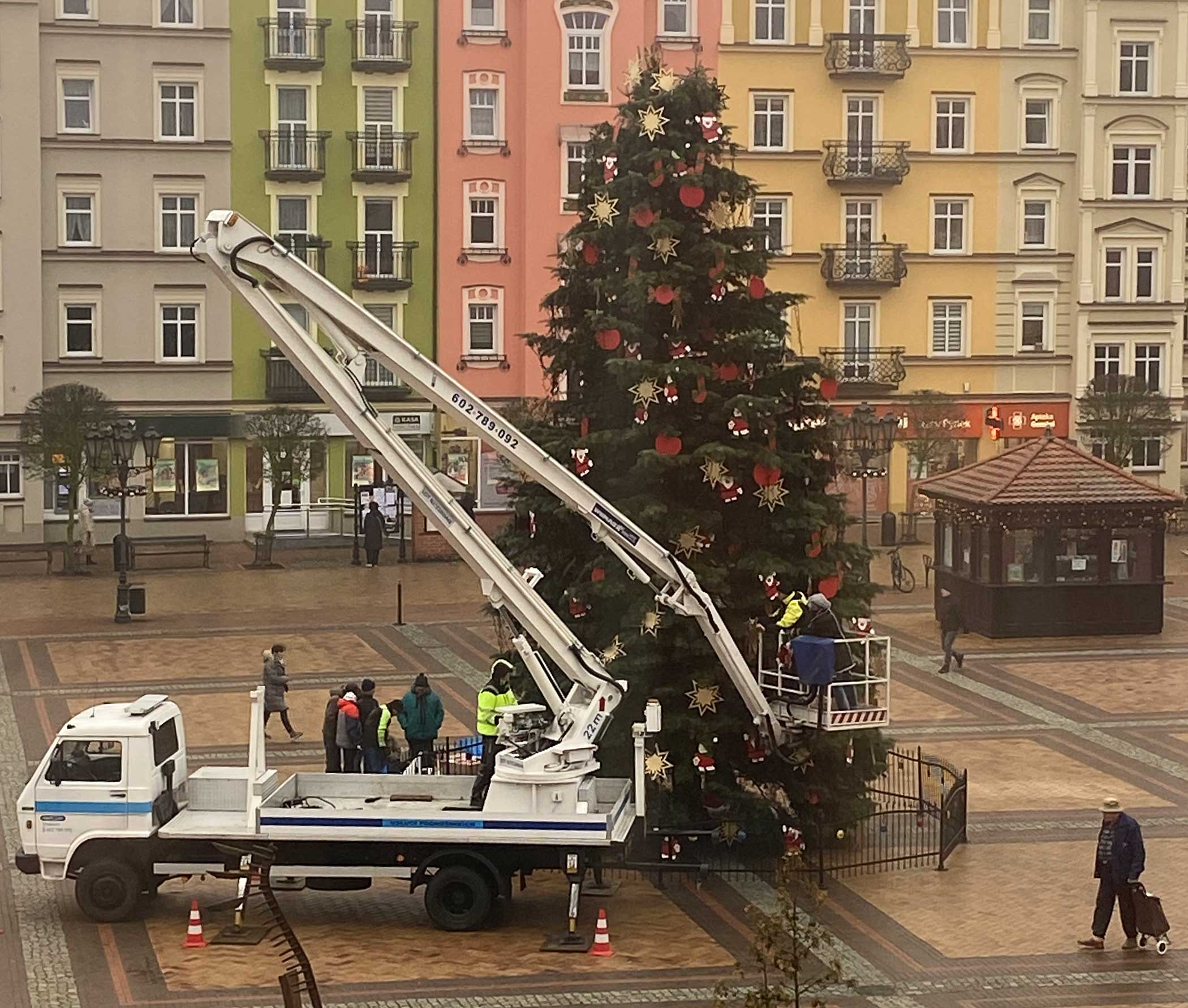 Na starówkę przyjechał nawet podnościk, aby okazałe drzewko od ziemi po sam czub ustroić przygotowanym specjalnie na tę okazję dekoracjami. Oczywiście, wszystkie przygotowali uczestnicy WTZ.