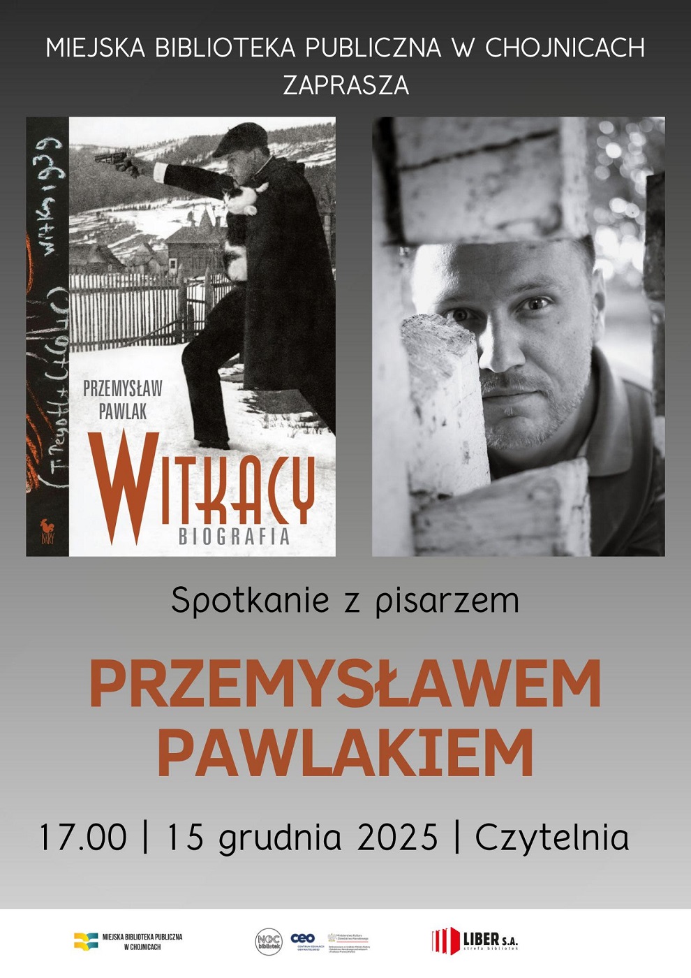 Miejska Biblioteka Publiczna w Chojnicach zaprasza na spotkanie z pisarzem Przemysławem Pawlakiem, autorem książki „Witkacy. Biografia”. Odbędzie się ono w poniedziałek 15 grudnia o godz. 17:00 w Czytelni. Spotkanie to jest nagrodą, którą biblioteka otrzymała za relację z tegorocznej Nocy Bibliotek. Rozmowę poprowadzi historyk Robert Kozłowski. Współorganizatorem wydarzenia jest Centrum Edukacji Obywatelskiej, a partnerem firma Liber SA. Dofinansowane zostało ze środków Ministra Kultury i Dziedzictwa Narodowego pochodzących z Funduszu Promocji Kultury.