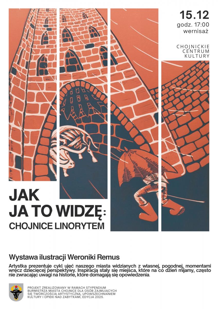 W kolekcji "Jak ja to widzę: Chojnice linorytem" Weronika Remus prezentuje cykl ujęć naszego miasta widzianych z własnej, pogodnej - momentami wręcz dziecięcej - perspektywy. Inspiracją stały się miejsca, które na co dzień mijamy, często nie zwracając uwagi na historie domagające się opowiedzenia.