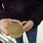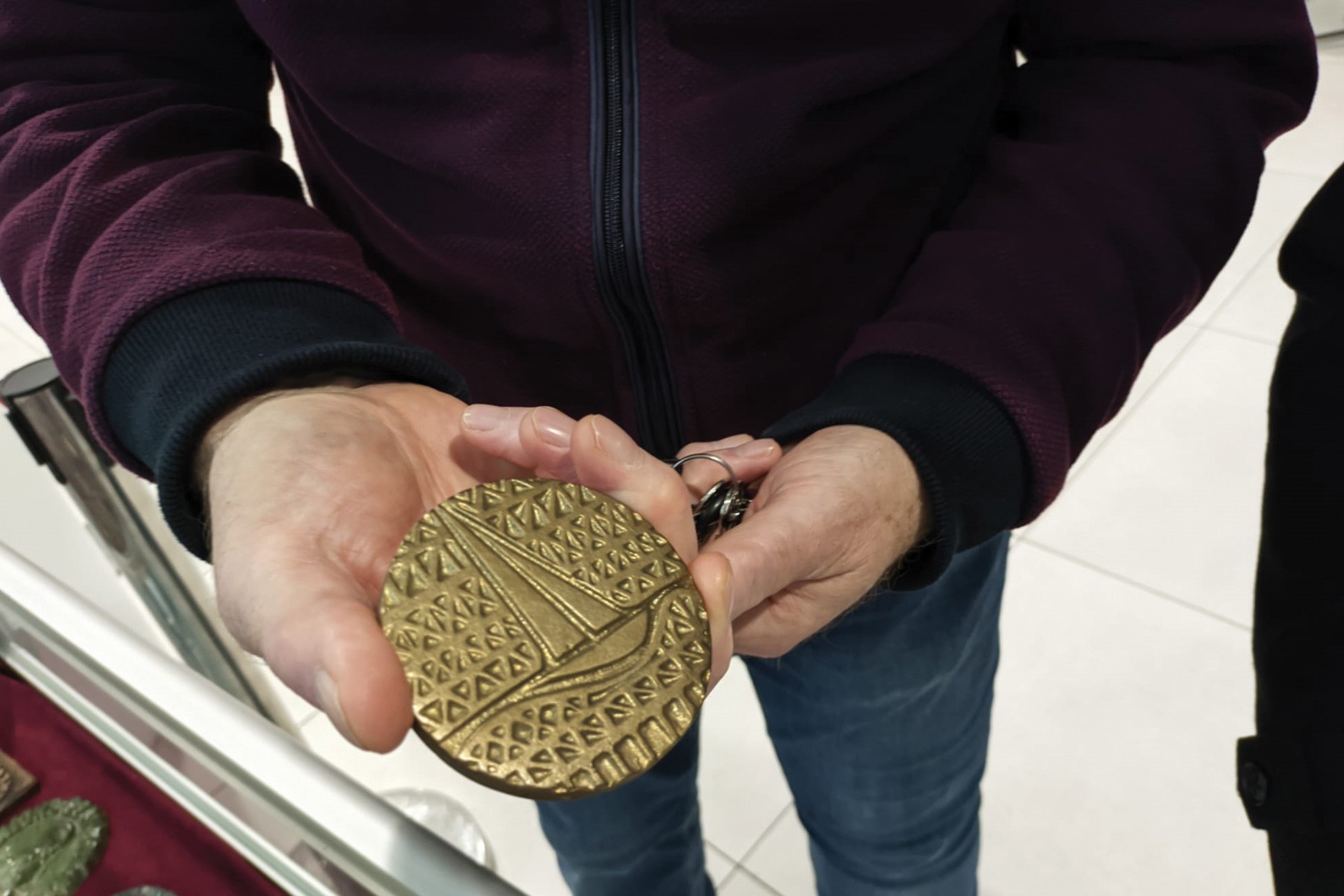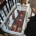 Chłopak pokazuje eksponaty: medale, stare monety, pieczęcie.