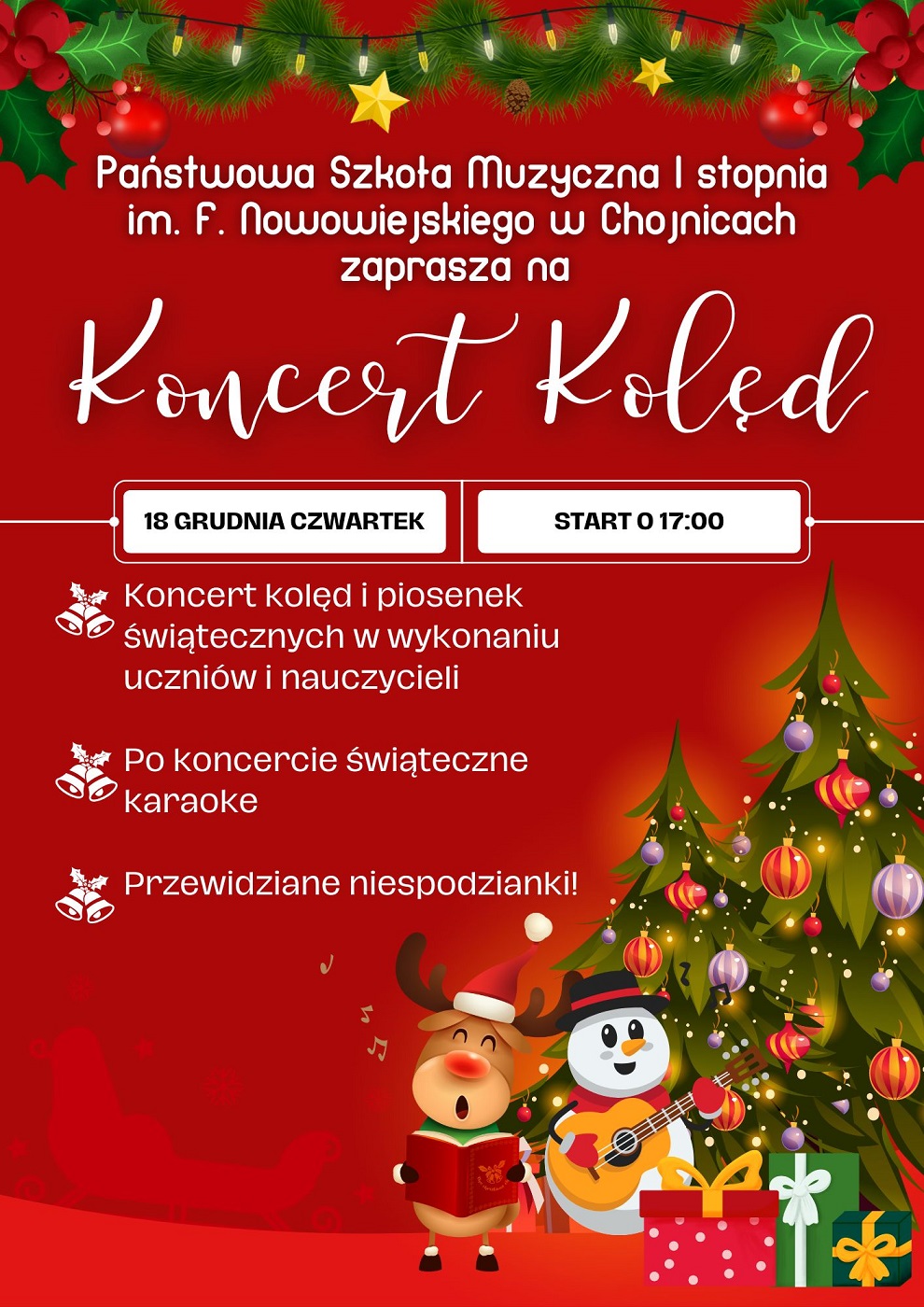 Wydarzenie zapowiada się jako pełne radości, wspólnego śpiewania i świątecznego blasku. To idealna okazja, by poczuć klimat nadchodzących Świąt Bożego Narodzenia i docenić talent młodych muzyków z chojnickiej szkoły.