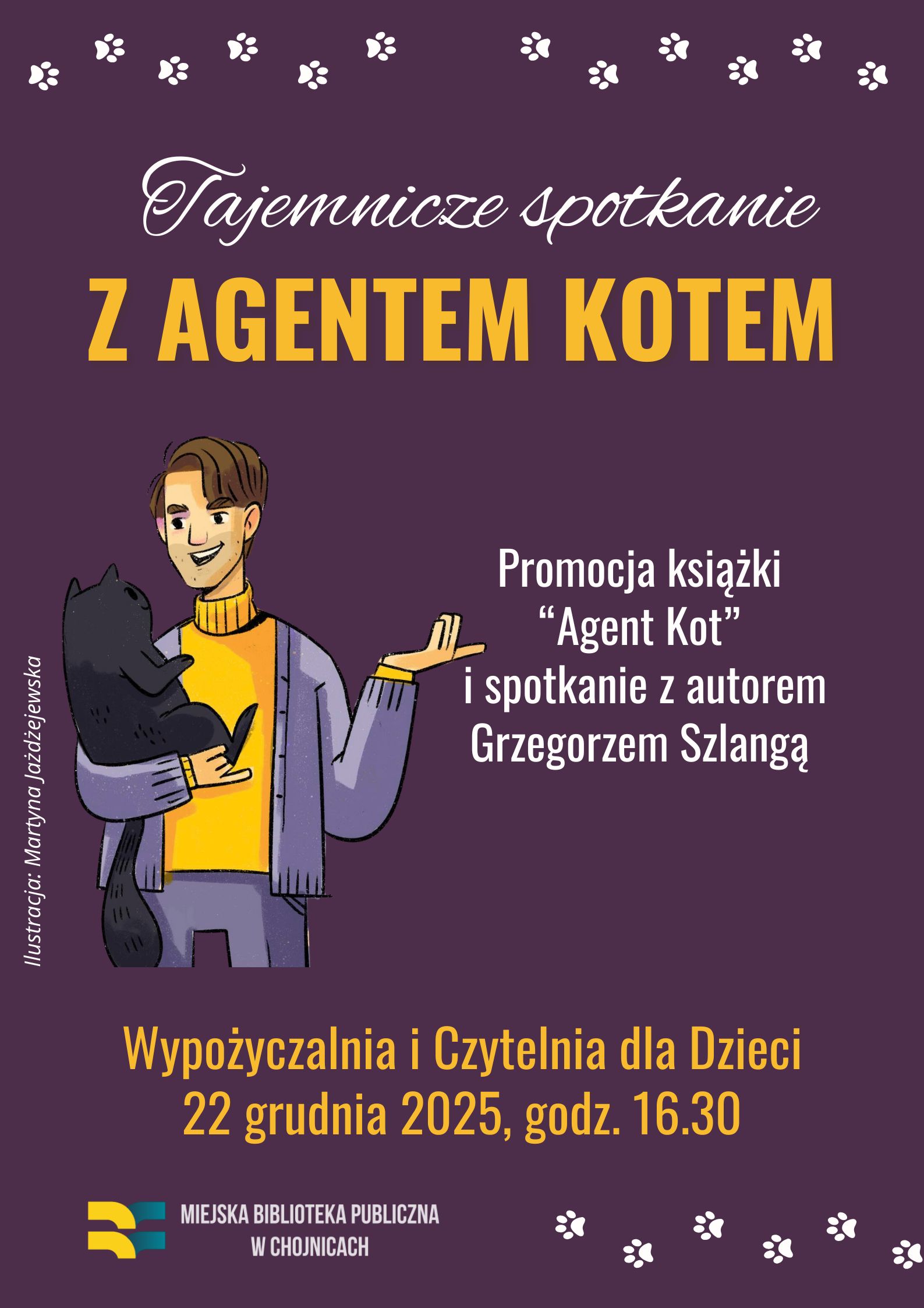 Zapraszamy na promocję książki Grzegorza Szlangi „Agent Kot”, która odbędzie się w poniedziałek 22 grudnia 2025 o godz. 16:30 w Wypożyczalni i Czytelni dla Dzieci.