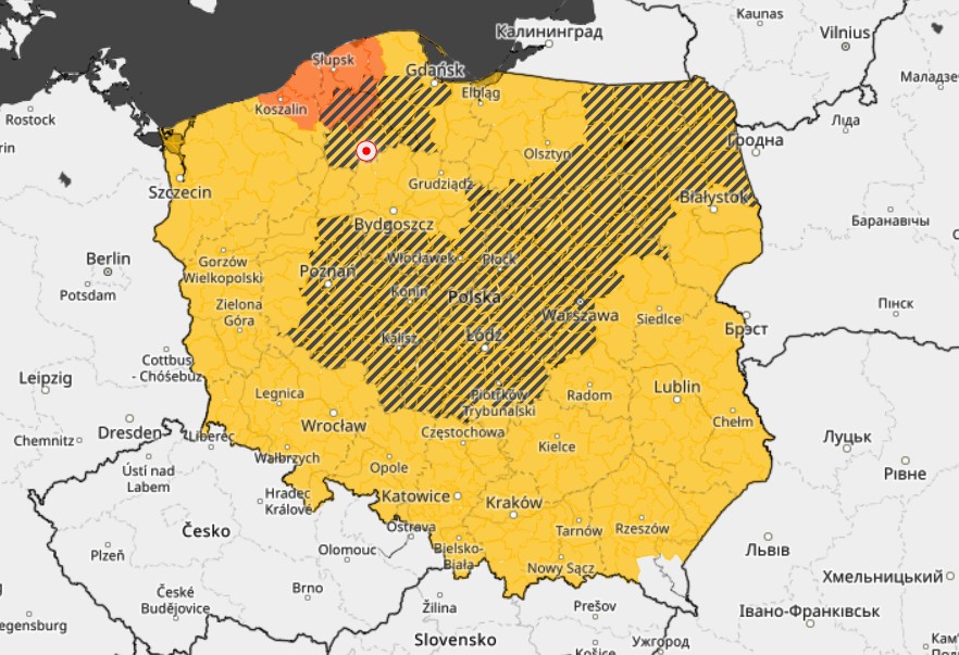 Wystąpią zawieje i zamiecie śnieżne spowodowane opadami śniegu i wiatrem o średniej prędkości do 30 km/h, w porywach do 60 km/h, z kierunków zachodnich. W rejonie wybrzeża średnia prędkość wiatru do 45 km/h, w porywach do 70 km/h.