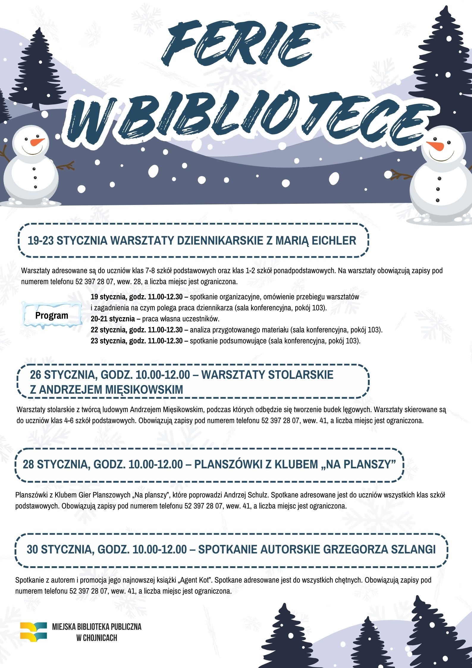 Miejska Biblioteka Publiczna w Chojnicach zaprasza do udziału w zajęciach organizowanych podczas ferii zimowych. Oferta skierowana jest do dzieci i młodzieży.