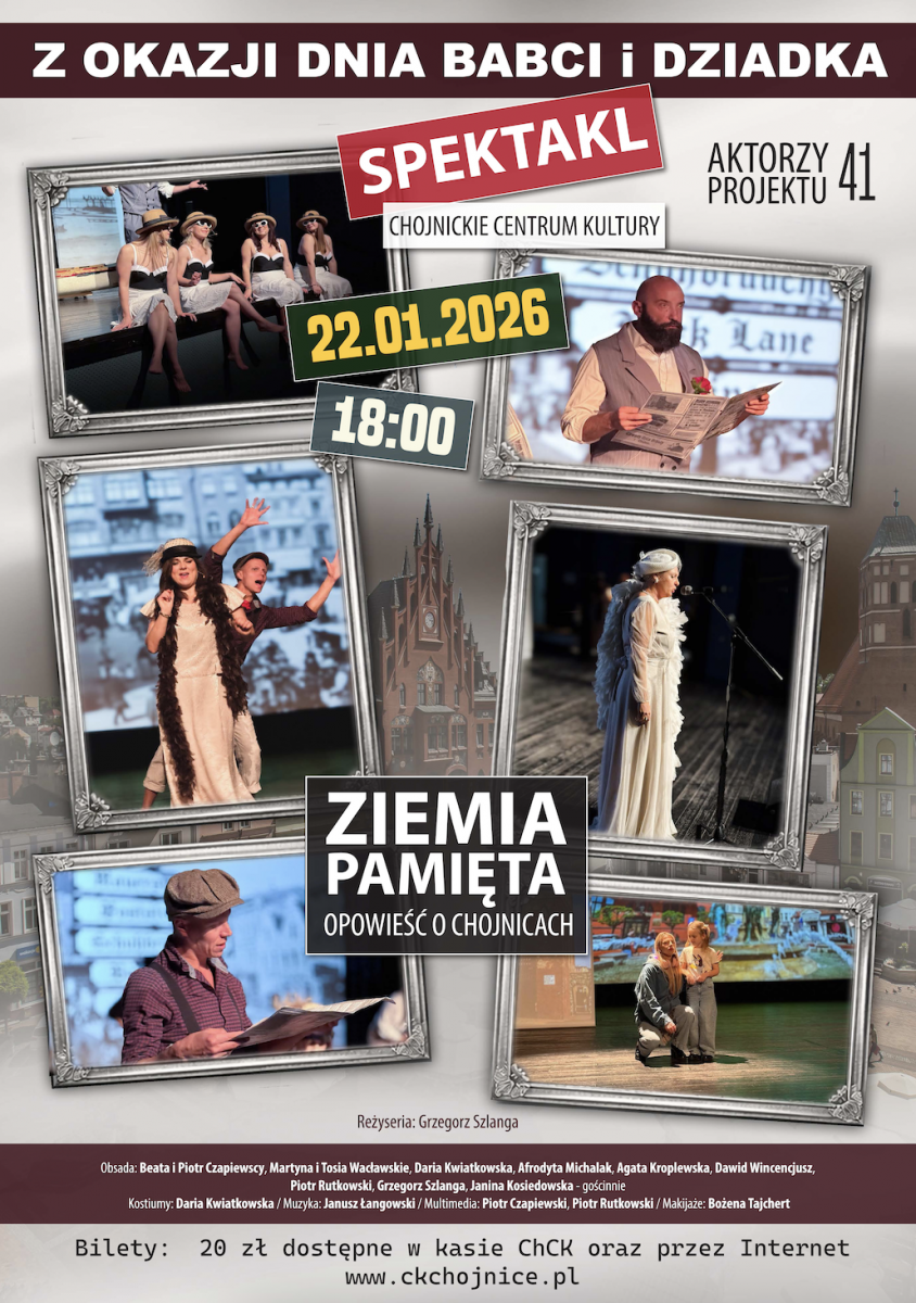 Aktorzy Projektu 41, działającego w Chojnickim Centrum Kultury, zapraszają do teatralnych obchodów Dnia Babci i Dziadka. Spektakl "Ziemia pamięta. Opowieść o Chojnicach" zaprezentowany zostanie premierowo. Pokaz przedpremierowy odbył się podczas XI Koncertu Kawiarenki Piosenki Polskiej i jednocześnie wpisał się w obchody 750-lecia miasta Chojnice. Teraz po raz pierwszy będzie okazja do zobaczenia pełnej wersji opowieści o Chojnicach, która nie tylko wspomina przeszłość, ale także spogląda w przyszłość naszego miasta.