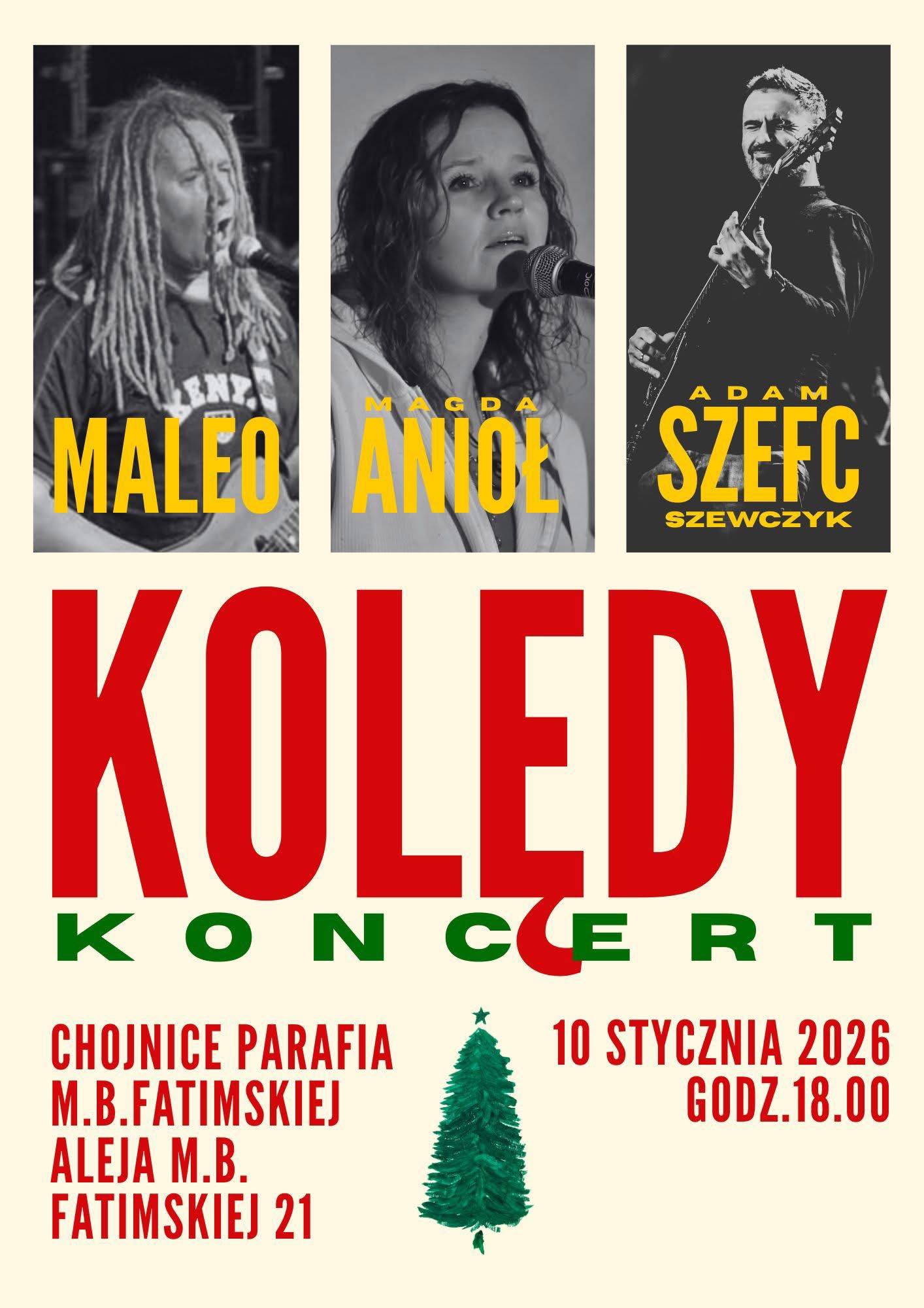 Już dziś o godz. 18.00 w Chojnicach odbędzie się wyjątkowy koncert kolęd. W Parafii Matki Bożej Fatimskiej przy Alei M.B. Fatimskiej 21 usłyszymy kolędy w wykonaniu znakomitych artystów: Maleo, Magdy Anioł oraz Adama Szefa Szewczyka. To spotkanie z muzyką, która łączy świąteczną tradycję z żywym, poruszającym brzmieniem i wspólnym kolędowaniem.