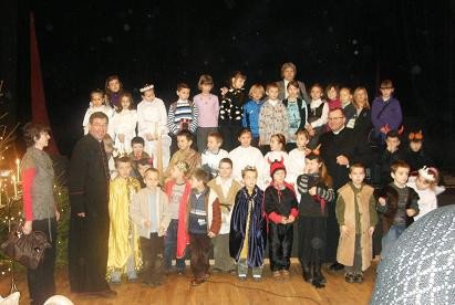 Pierwszacy zostali poproszeni o zaprezentowanie jasełek. Było to dla nich ogromne wyzwanie, gdyż do tej pory nie występowali jeszcze dla takiej publiczności i to tak daleko od swych domów i szkoły. Bardzo dobrze wywiązali się jednak z podjętego zadania, co zauważył ksiądz biskup, dziękując maluchom za przedstawienie pt. „Dnia jednego o północy”. Ks. Biskup zwrócił uwagę, iż w poprzednich latach występowały grupy młodzieży, a jasełka potrafią też wspaniale przedstawić pierwszacy. Za swój występ uczniowie z Brus otrzymali gromkie brawa, wiele słów uznania za odwagę i właściwe przedstawienie swych postaci oraz za śpiew kolęd. Maluchy występując na scenie Miejskiego Domu Kultury w Pelplinie nie miały żadnej tremy, co dziwiło głównie dorosłych uczestników tego noworocznego spotkania. Uczniów do występu przygotowała wychowawczyni Aleksandra Turowska przy współudziale katechetki Gabrieli Lepak. Będąc w Pelplinie, uczniowie bruskiej podstawówki pamiętali, iż w tym mieście 6 czerwca 1999 roku przebywał Jan Paweł II. Mimo prawdziwie zimowej aury wszyscy z radością weszli na Górę Jana Pawła II, by chociaż przez chwilę pobyć w miejscu, gdzie Eucharystię sprawował patron Szkoły Podstawowej w Brusach. Wśród wielu herbów umieszczonych w bezpośrednim sąsiedztwie Papieskiego Krzyża dzieci odnalazły także herb Brus. Uczniowie z uśmiechem na twarzach, pełni nowych wrażeń i przeżyć wrócili do swoich domów.