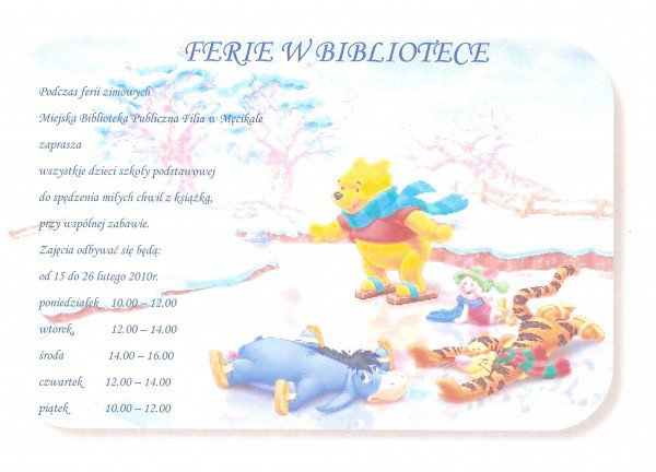 Miejska Biblioteka Publiczna zaprasza na ferie do filii w Męcikale.Program ferii.
