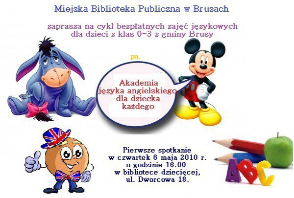 Miejska Biblioteka Publiczna w Brusach zaprasza dzieci klas 0-III z terenu miasta i gminy Brusy na bezpłatne zajęcia pn. „Akademia języka angielskiego dla dziecka każdego”. Spotkanie organizacyjne odbędzie się 6 maja br. o godzinie 16.00 w Miejskiej Bibliotece Publicznej w Brusach. W przypadku większej ilości zgłoszeń, utworzona zostanie druga grupa, która rozpocznie zajęcia o godzinie 17.30. Podane ramy godzinowe stanowią wstępną propozycję z możliwością ich dostosowania do potrzeb uczestników.Celem zajęć jest rozbudzenie kultury czytelniczej oraz zapoznanie z podstawowymi słówkami i zasadami języka angielskiego, podczas których dzieci będą miały możliwość uczestniczenia w grach i zabawach ruchowych, plastycznych, literackich i baśniowych podróżach z bohaterami książek. Wszystko przeplatane będzie śpiewaniem piosenek i nauką podstaw języka angielskiego.