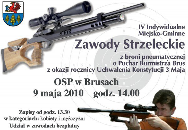 9 maja (niedziela) odbędą się IV Indywidualne Miejsko-Gminne Zawody Strzeleckie z broni pneumatycznej o Puchar Burmistrza Brus z okazji rocznicy uchwalenia Konstytucji 3 Maja.