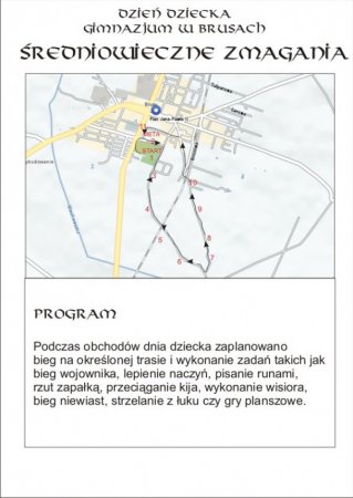 Samorząd uczniowski i klub wolontariatu, przy wsparciu drużyny wojów Gautar, przygotowali liczne konkurencje nawiązujące do średniowiecza.Na początek odbędzie się pokaz musztry, sposobu walk przy użyciu broni wczesnośredniowiecznej oraz prezentacji uzbrojenia wojów z X wieku przygotowana przez drużynę wojów z Brus. Następnie każda klasa wspólnie z wychowawcą uda się na trasę biegu. Pierwszą konkurencją jest budowa kartonowego zamku. Na kolejnych punktach kontrolnych czekać będą przeróżne zadania. Uczniowie będą musieli ulepić naczynie z gliny, spróbować swych sił w planszowych grach z okresu średniowiecza, zmierzą się z ortografią pisząc runami, przygotują elementy biżuterii, sprawdzą się w strzelaniu z łuku czy w konkurencjach plebejskich takich jak bieg wojownika czy rzut "zapałką". Nagrodą dla zwycięskiej klasy będzie pełna sakiewka drogocennych monet oraz sława po wsze czasy.