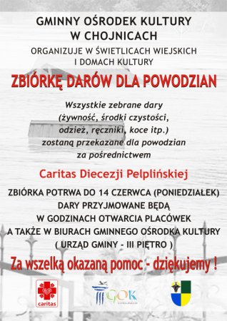 Gminny Ośrodek Kultury, który w podległych mu placówkach prowadzi zbiórkę darów dla powodzian, postanowił przedłużyć czas trwania akcji. Najpotrzebniejsze artykuły będzie można składać w wyznaczonych miejscach do 14 czerwca.