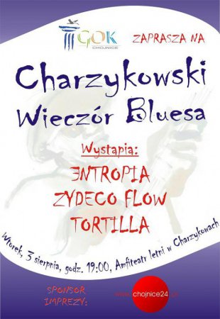 Scena charzykowskiego Amfiteatru im. Ottona Weilandta gościć będzie trzy wyjątkowe zespoły bluesowe: Entropia, Zydeco Flow oraz Tortilla. Wszystko to w ramach imprezy, organizowanej przez Gminny Ośrodek Kultury, a sponsorowanej przez portal chojnice24.pl.