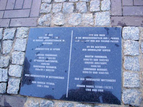 Na płycie znalazły się nazwiska trzech profesorów, wywodzących się z Chojnic, którzy byli rektorami uniwersytetu w Lipsku, m.in. Marcin Fuhrmann, znany jako Marcin Chojnicki. Wszyscy trzej zajmowali się teologią i filozofią. Natomiast Jan Daniel Titius był historykiem. Jaruszewski wskazuje, że nasze miasto niegdyś było miejscem, w którym ścierały się dwie kultury - niemiecka i polska. I właśnie jedna część tablicy jest w języku niemieckim.