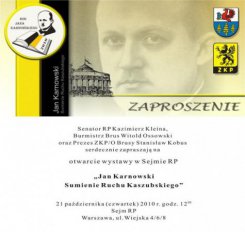 Informujemy, że 21 października (czwartek) o godz. 12.00 w Sejmie RP w Warszawie odbędzie się otwarcie wystawy „Jan Karnowski Sumienie Ruchu Kaszubskiego”. Ekspozycja była dostępna dotychczas w Brusach, Czersku i Chojnicach. Na wystawę zapraszają: Senator RP Kazimierz Kleina, Burmistrz Brus Witold Ossowski oraz Prezes ZKP/O Brusy Stanisław Kobus.