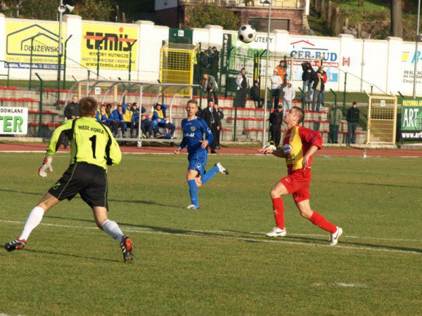 ,,Miedziance". Głodni sukcesu piłkarze Chojniczanki narzucili swój styl gry. To była prawdziwa bitwa. Oba zespoły od samego początku ,,gryzły trawę". Trudne zadanie miał artbiter główny spotkania, który nie panował nad emocjami jakie panowały na boisku. Efektem twardej gry była kontuzja kapitana Miedzi Marcina Garucha w 11. minucie , który po faulu Marcina Trojanowskiego musiał opuścić boisko. Na pierwszego gola w meczu czekaliśmy do 23 minuty. W polu karnym faulowany był Piotr Kwietniewski, a jedenastkę na bramkę zamienił Sławomir Ziemak. Bramka ta z pewnością dodała wiatru w żagle zespołowi Grzegorza Kapicy. Pochwalić należy również zespół gości, którzy tylko dzięki dobrej postawie Krzysztofa Barana pomiędzy słupkami nie doprowadzili do remisu. Po pierwszych 45 minutach do szatni schodziliśmy, prowadząc 1:0. Drugą połowę rozpoczęliśmy od mocnego uderzenia. Akcję, po której ręce same składały się do bicia brawo, chojniczanie przeprowadzili w 53. minucie. Szarżujący prawą stroną boiska Aleksander Atanackovic idealnie wyłożył futbolówkę zza pole karne kapitonowi Chojniczanki, a ten zachowując zimną krew precyzyjnym strzałem sprawił radośc kibicom, wyprowadzając nasz zespół na 2:0. Goście pomimo dwubramkowej straty dążyli do strzelenia honorowej bramki. Nie znaleźli jednak sposobu na dobrze dysponowanego bramkarza gospodarzy. Chojniczanka zadała nokautujący cios swojemu w rywalowi w 93. minucie. W sytuacji sam na sam znalazł się Szymon Gibczyński, który przegrał co prawda ów pojedynek, ale bramkarz gości bezradny był wobec dobitki Tomasza Pestki, który ustawił wynik meczu. Na trybunach rozległo się głośne ,,dziękujemy, dziękujemy".