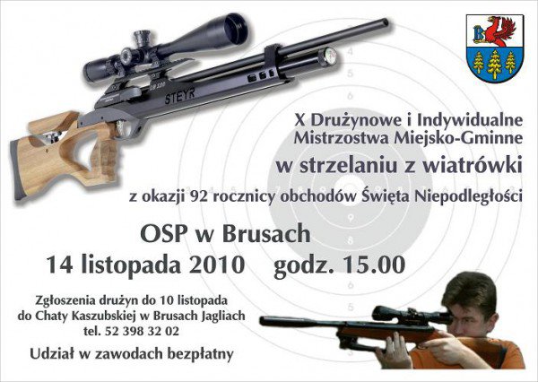 Z okazji 92. rocznicy obchodów Święta Niepodległości, 14 listopada br. (niedziela) w remizie OSP w Brusach o godz. 15.00 odbędą się X Drużynowe i Indywidualne mistrzostwa w strzelaniu z wiatrówki.
