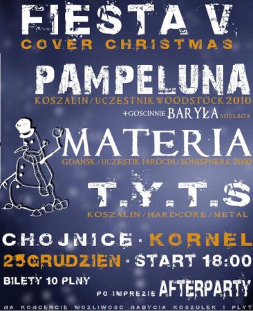 W pierwszy dzień świąt w pubie Kornel odbędzie się koncert Fiesta V COVER CHRISTMAS. Zagrają Pampeluna, Materia i T.Y.T.S.